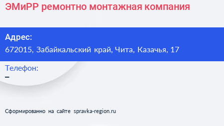 ЭМиРР, ремонтно-монтажная компания по адресу 672015, Забайкальский край, Чита, Казачья, 17 в дальнейшем Организация, размещена в следующих категориях: