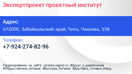 Экспертпроект, проектный институт по адресу 672000, Забайкальский край, Чита, Чкалова, 158 в дальнейшем Организация, размещена в следующих категориях: