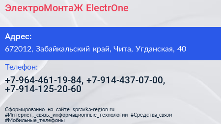 ЭлектроМонтаЖ ElectrOne по адресу 672012, Забайкальский край, Чита, Угданская, 40 в дальнейшем Организация, размещена в следующих категориях: