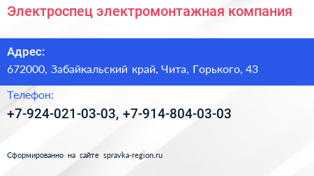 Электроспец, электромонтажная компания по адресу 672000, Забайкальский край, Чита, Горького, 43 в дальнейшем Организация, размещена в следующих категориях: