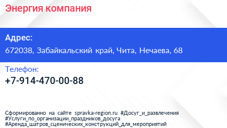 Энергия, компания по адресу 672038, Забайкальский край, Чита, Нечаева, 68 в дальнейшем Организация, размещена в следующих категориях: