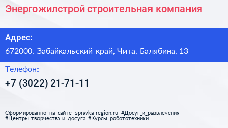 Энергожилстрой, строительная компания по адресу 672000, Забайкальский край, Чита, Балябина, 13 в дальнейшем Организация, размещена в следующих категориях: