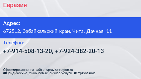 Евразия+ по адресу 672512, Забайкальский край, Чита, Дачная, 11 в дальнейшем Организация, размещена в следующих категориях: