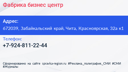 Фабрика, бизнес-центр по адресу 672039, Забайкальский край, Чита, Красноярская, 32а к1 в дальнейшем Организация, размещена в следующих категориях: