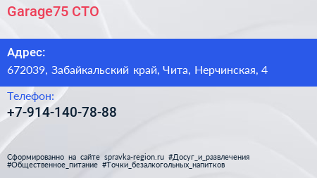 Garage75, СТО по адресу 672039, Забайкальский край, Чита, Нерчинская, 4 в дальнейшем Организация, размещена в следующих категориях: