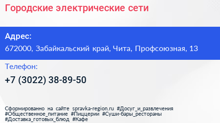 Городские электрические сети по адресу 672000, Забайкальский край, Чита, Профсоюзная, 13 в дальнейшем Организация, размещена в следующих категориях: