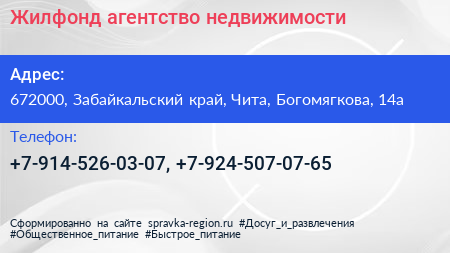 Жилфонд, агентство недвижимости по адресу 672000, Забайкальский край, Чита, Богомягкова, 14а в дальнейшем Организация, размещена в следующих категориях: