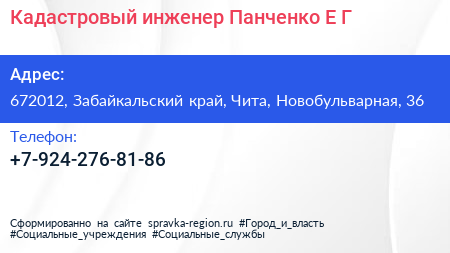 Кадастровый инженер Панченко Е.Г. по адресу 672012, Забайкальский край, Чита, Новобульварная, 36 в дальнейшем Организация, размещена в следующих категориях: