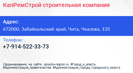 КапРемСтрой, строительная компания по адресу 672000, Забайкальский край, Чита, Чкалова, 135 в дальнейшем Организация, размещена в следующих категориях: