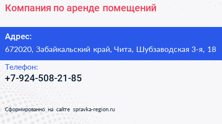 Компания по аренде помещений по адресу 672020, Забайкальский край, Чита, Шубзаводская 3-я, 18 в дальнейшем Организация, размещена в следующих категориях:
