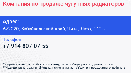 Компания по продаже чугунных радиаторов по адресу 672020, Забайкальский край, Чита, Лазо, 112Б в дальнейшем Организация, размещена в следующих категориях: