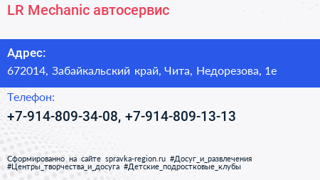 LR-Mechanic, автосервис по адресу 672014, Забайкальский край, Чита, Недорезова, 1е в дальнейшем Организация, размещена в следующих категориях: