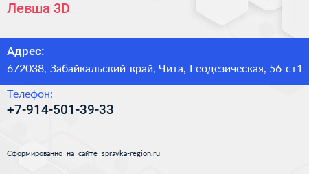 Левша 3D по адресу 672038, Забайкальский край, Чита, Геодезическая, 56 ст1 в дальнейшем Организация, размещена в следующих категориях: