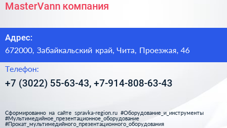 MasterVann, компания по адресу 672000, Забайкальский край, Чита, Проезжая, 46 в дальнейшем Организация, размещена в следующих категориях: