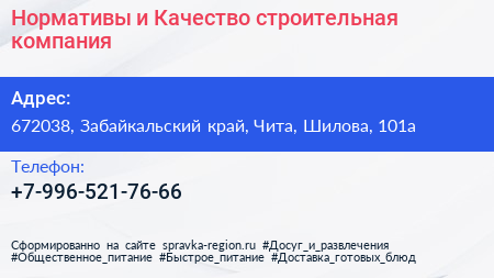 Нормативы и Качество, строительная компания по адресу 672038, Забайкальский край, Чита, Шилова, 101а в дальнейшем Организация, размещена в следующих категориях: