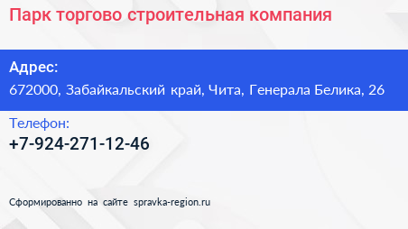 Парк, торгово-строительная компания по адресу 672000, Забайкальский край, Чита, Генерала Белика, 26 в дальнейшем Организация, размещена в следующих категориях: