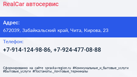 RealCar, автосервис по адресу 672039, Забайкальский край, Чита, Кирова, 23 в дальнейшем Организация, размещена в следующих категориях: