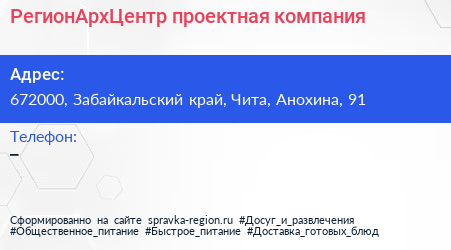 РегионАрхЦентр, проектная компания по адресу 672000, Забайкальский край, Чита, Анохина, 91 в дальнейшем Организация, размещена в следующих категориях: