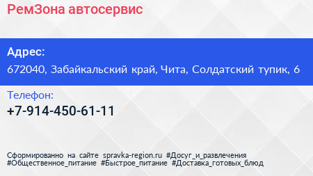 РемЗона, автосервис по адресу 672040, Забайкальский край, Чита, Солдатский тупик, 6 в дальнейшем Организация, размещена в следующих категориях: