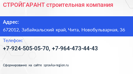 СТРОЙГАРАНТ, строительная компания по адресу 672012, Забайкальский край, Чита, Новобульварная, 36 в дальнейшем Организация, размещена в следующих категориях: