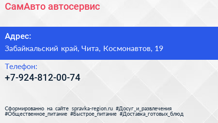 СамАвто, автосервис по адресу Забайкальский край, Чита, Космонавтов, 19 в дальнейшем Организация, размещена в следующих категориях: