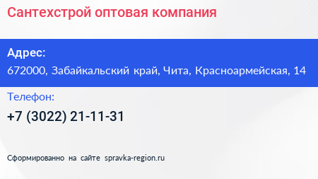 Сантехстрой, оптовая компания по адресу 672000, Забайкальский край, Чита, Красноармейская, 14 в дальнейшем Организация, размещена в следующих категориях: