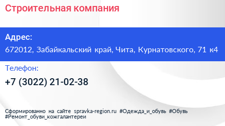Строительная компания по адресу 672012, Забайкальский край, Чита, Курнатовского, 71 к4 в дальнейшем Организация, размещена в следующих категориях: