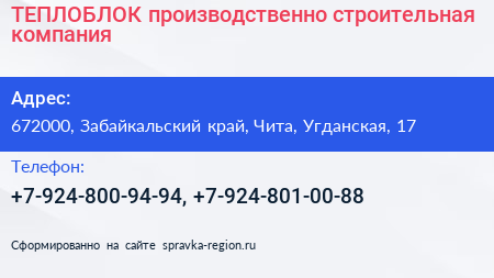ТЕПЛОБЛОК, производственно-строительная компания по адресу 672000, Забайкальский край, Чита, Угданская, 17 в дальнейшем Организация, размещена в следующих категориях:
