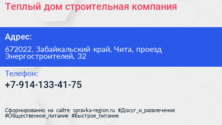 Теплый дом, строительная компания по адресу 672022, Забайкальский край, Чита, проезд Энергостроителей, 32 в дальнейшем Организация, размещена в следующих категориях: