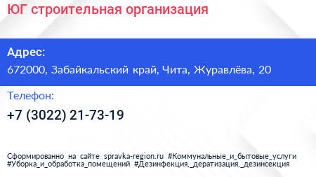ЮГ, строительная организация по адресу 672000, Забайкальский край, Чита, Журавлёва, 20 в дальнейшем Организация, размещена в следующих категориях: