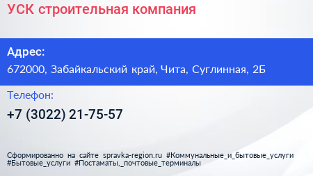 УСК, строительная компания по адресу 672000, Забайкальский край, Чита, Суглинная, 2Б в дальнейшем Организация, размещена в следующих категориях: