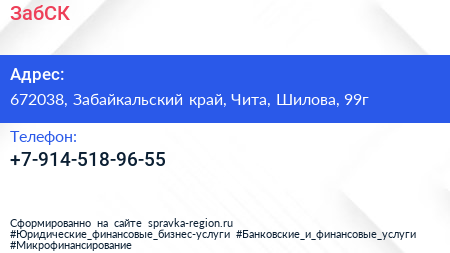 ЗабСК по адресу 672038, Забайкальский край, Чита, Шилова, 99г в дальнейшем Организация, размещена в следующих категориях: