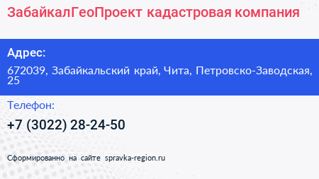 ЗабайкалГеоПроект, кадастровая компания по адресу 672039, Забайкальский край, Чита, Петровско-Заводская, 25 в дальнейшем Организация, размещена в следующих категориях: