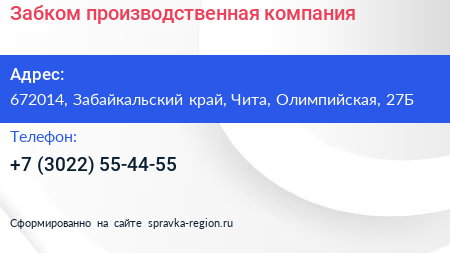 Забком, производственная компания по адресу 672014, Забайкальский край, Чита, Олимпийская, 27Б в дальнейшем Организация, размещена в следующих категориях: