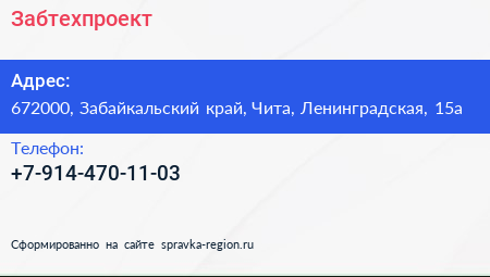 Забтехпроект по адресу 672000, Забайкальский край, Чита, Ленинградская, 15а в дальнейшем Организация, размещена в следующих категориях: