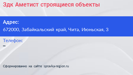Здк Аметист, строящиеся объекты по адресу 672000, Забайкальский край, Чита, Июньская, 3 в дальнейшем Организация, размещена в следующих категориях: