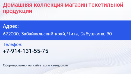 Домашняя коллекция, магазин текстильной продукции по адресу 672000, Забайкальский край, Чита, Бабушкина, 90 в дальнейшем Организация, размещена в следующих категориях: