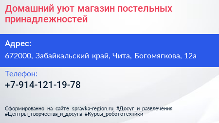 Домашний уют, магазин постельных принадлежностей по адресу 672000, Забайкальский край, Чита, Богомягкова, 12а в дальнейшем Организация, размещена в следующих категориях:
