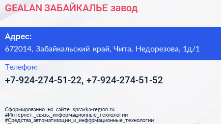 GEALAN ЗАБАЙКАЛЬЕ, завод по адресу 672014, Забайкальский край, Чита, Недорезова, 1д/1 в дальнейшем Организация, размещена в следующих категориях: