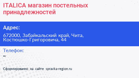 ITALICA, магазин постельных принадлежностей по адресу 672000, Забайкальский край, Чита, Костюшко-Григоровича, 44 в дальнейшем Организация, размещена в следующих категориях: