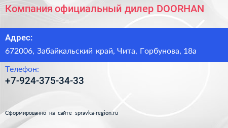 Компания, официальный дилер DOORHAN по адресу 672006, Забайкальский край, Чита, Горбунова, 18а в дальнейшем Организация, размещена в следующих категориях: