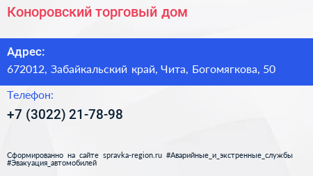 Коноровский, торговый дом по адресу 672012, Забайкальский край, Чита, Богомягкова, 50 в дальнейшем Организация, размещена в следующих категориях: