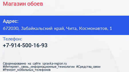 Магазин обоев по адресу 672030, Забайкальский край, Чита, Космонавтов, 1 в дальнейшем Организация, размещена в следующих категориях:
