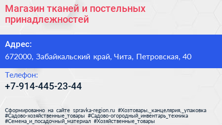 Магазин тканей и постельных принадлежностей по адресу 672000, Забайкальский край, Чита, Петровская, 40 в дальнейшем Организация, размещена в следующих категориях: