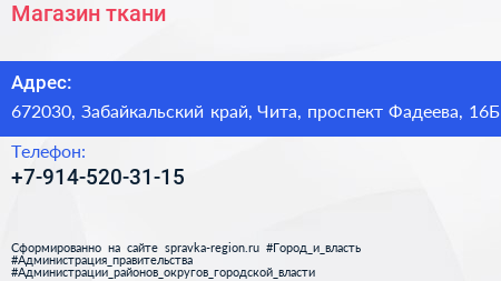 Магазин ткани по адресу 672030, Забайкальский край, Чита, проспект Фадеева, 16Б в дальнейшем Организация, размещена в следующих категориях: