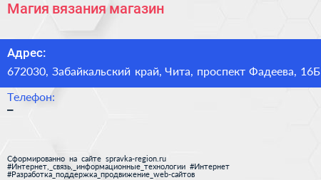 Магия вязания, магазин по адресу 672030, Забайкальский край, Чита, проспект Фадеева, 16Б в дальнейшем Организация, размещена в следующих категориях: