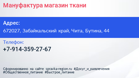 Мануфактура, магазин ткани по адресу 672027, Забайкальский край, Чита, Бутина, 44 в дальнейшем Организация, размещена в следующих категориях: