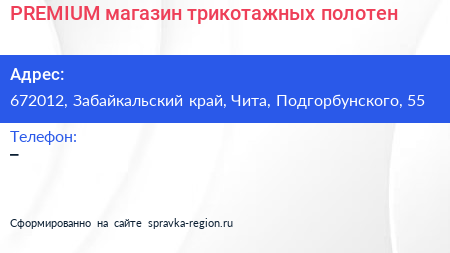 PREMIUM, магазин трикотажных полотен по адресу 672012, Забайкальский край, Чита, Подгорбунского, 55 в дальнейшем Организация, размещена в следующих категориях: