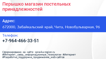 Перышко, магазин постельных принадлежностей по адресу 672000, Забайкальский край, Чита, Новобульварная, 96 в дальнейшем Организация, размещена в следующих категориях: