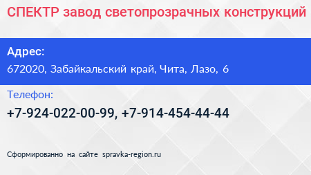 СПЕКТР, завод светопрозрачных конструкций по адресу 672020, Забайкальский край, Чита, Лазо, 6 в дальнейшем Организация, размещена в следующих категориях:
